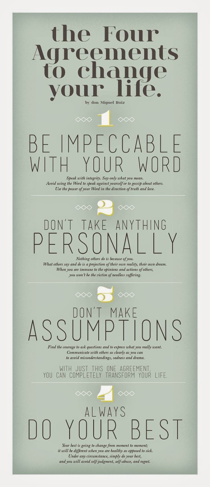 :: I think these four agreements are so good. I think we can all learn from them. I am still trying to figure things out each day. Life is ever changing.